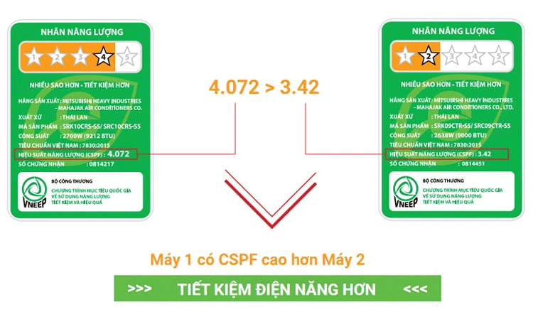 - có từ mức 1 sao đến 5 sao trên nhãn dãn tem và tương ứng với 5 cấp bậc khác nhau để dành riêng cho xếp hạng tiết kiệm điện. Nhãn 5 sao cũng là nhãn có hiệu suất năng lượng tốt nhất và khả năng tiết kiệm điện cao nhất.