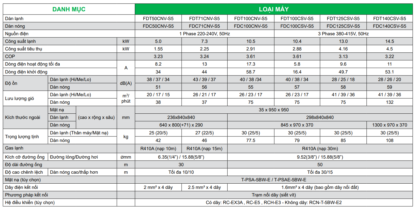 Thống số kỹ thuật Điều hòa âm trần Mitsubishi Heavy 45.000BTU 1 chiều 3 Pha FDT125CSV-S5: